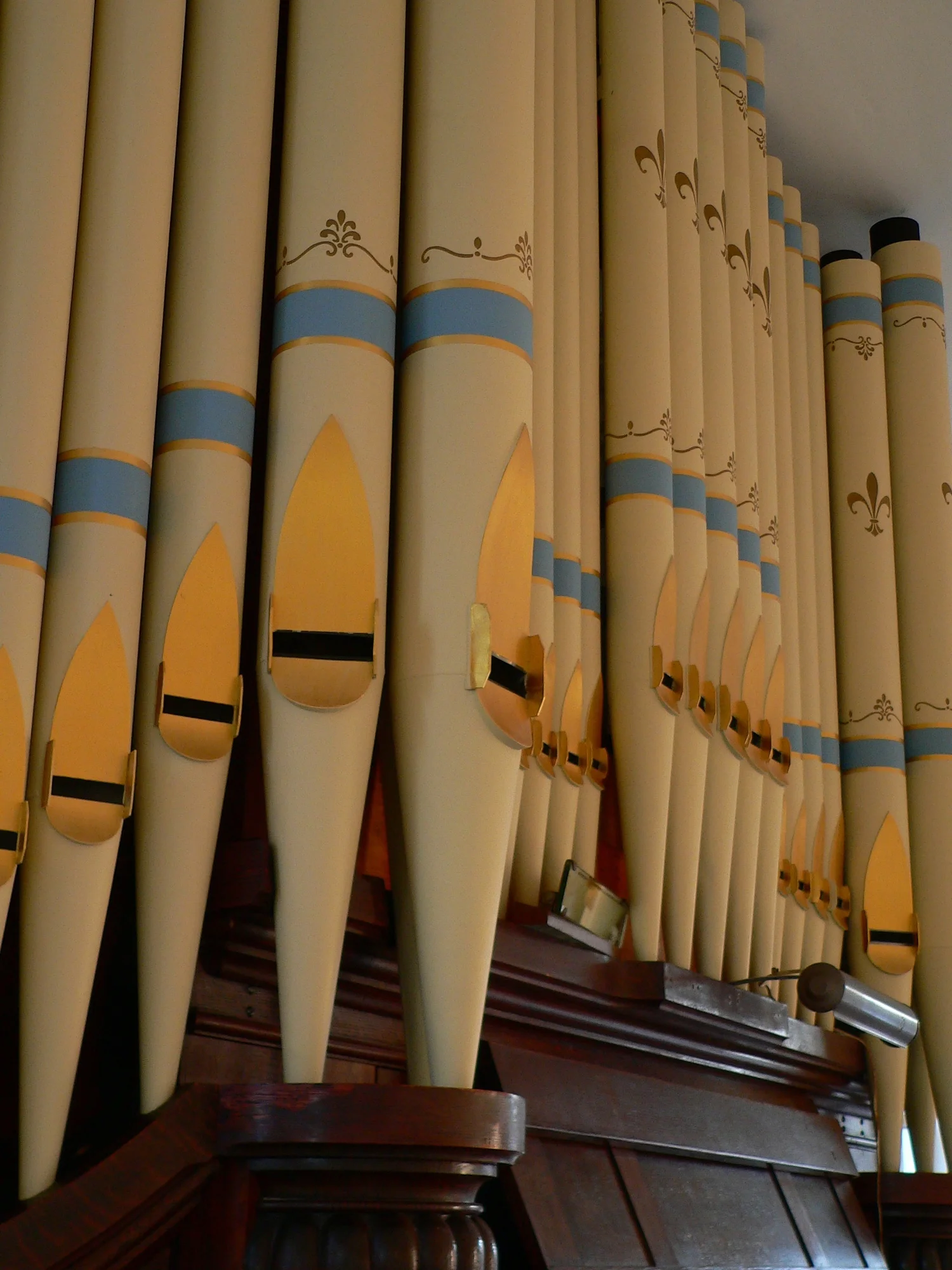 While we were glad to be permitted to do this work, it was somewhat difficult to include while the restoration was already underway. Originally we considered modification of the organ case to lower the impost far enough to restore the original outline of the façade, but for various reasons this was not possible. Our solution was to try and reintroduce the most “natural” appearance possible through altering pipe body lengths. In the case of the six pipes set in the two main corbels of the case, this meant the fabrication and use of Haskell re-entrant tubes. We found this a more elegant solution than the inexpertly executed miters they replaced. With a design plan in place we could then consider the application of a suitable color scheme and simple stencil pattern.