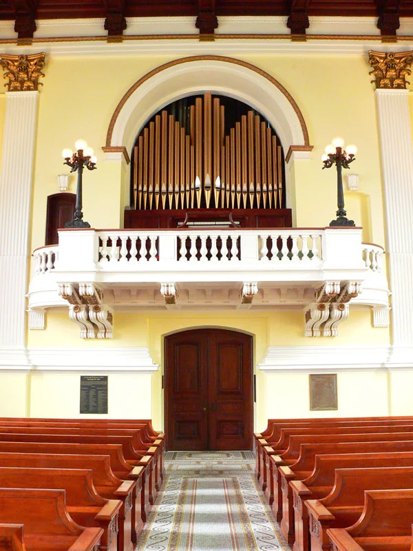 The instrument was originally conceived as two manuals and twenty-six ranks, with slider chests. It was among our first (if not the first) electric action instrument; the console was originally installed in the front of the church, but later moved to the gallery.